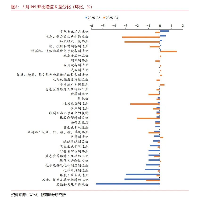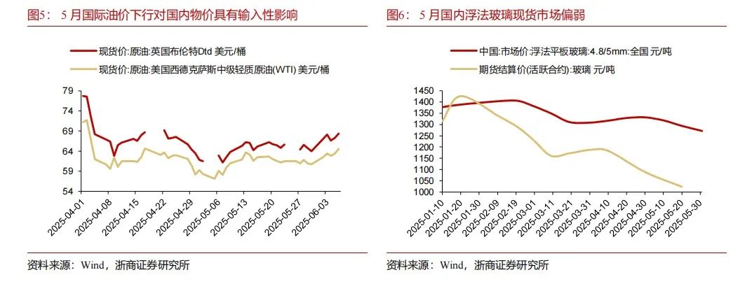 第二,国内部分能源和原材料价格季节性下降。从环比变动来看,煤炭需求处于淡季,电厂、港口存煤充足,加之新能源发电成本低、替代作用强,5月煤炭开采和洗选业价格下降3.0%,煤炭加工价格下降1.1%。南方地区高温雨水天气增多,影响部分房地产、基建项目施工,加之钢材、水泥等建材生产供给充足,黑色金属冶炼和压延加工业、非金属矿物制品业价格均下降1.0%,上述4个行业合计影响PPI环比下降约0.18个百分点。