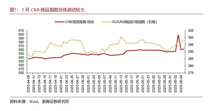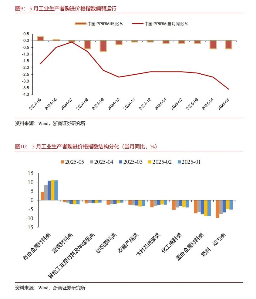 我们也多次提示,在外部环境不确定性提升的背景下,需要关注工业生产者购进价格,可能通过成本渠道影响后续企业利润。5月工业生产者购进价格同比下降3.6%,环比下降0.6%。从工业生产者购进价格的同比变化来看,大类行业中仅有色金属材料及电线类价格延续涨势。5月燃料动力类价格下降9.8%,黑色金属材料类价格下降7.3%,化工原料类价格下降5.4%,农副产品类价格下降2.6%,纺织原料类价格下降2.5%,建筑材料及非金属类价格下降1.1%;有色金属材料及电线类价格上涨4.6%。