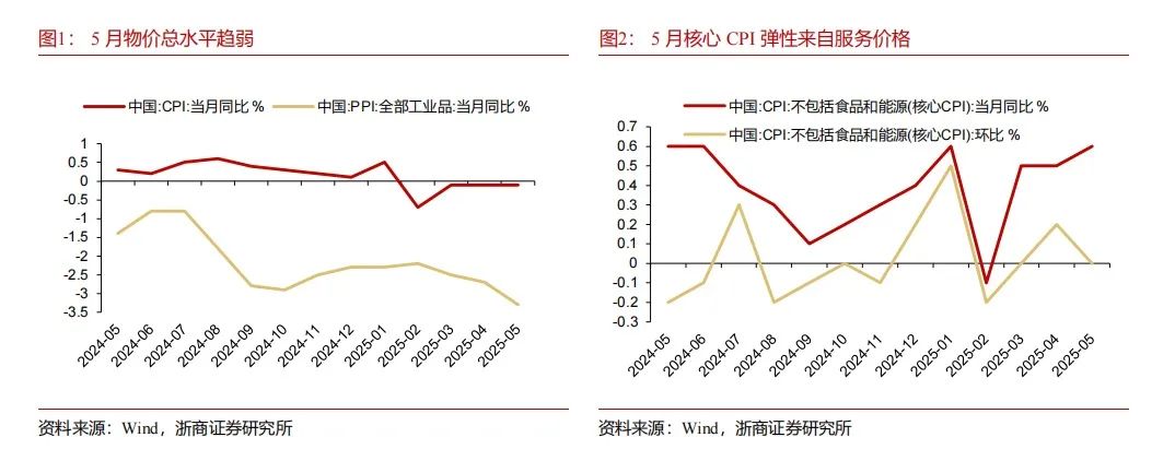 具体参见2025年6月9日报告《5月通胀:物价延续弱势运行,等待总需求侧发力》,如需报告全文或数据底稿,请联系团队成员或对口销售。 ]article_adlist-->全文约3500字,阅读大约需要10分钟 ]article_adlist-->核心观点 ]article_adlist-->5月CPI同比增速为-0.1%(前值-0.1%),好于市场预期(Wind一致预期为-0.2%),环比增速-0.2%(前值为0.1%),主要受能源价格下降影响,环比增速与我们前期预测一致。5月PPI同比增速录得-3.3%(前值-2.7%),略低于市场预期(Wind一致预期为-3.2%),环比下降0.4%(前值-0.4%),主要受国际定价的大宗商品价格下行等输入性因素影响,国内部分能源和原材料价格也出现了阶段性下行,新动能行业价格相对有韧性并维持了同比上行。