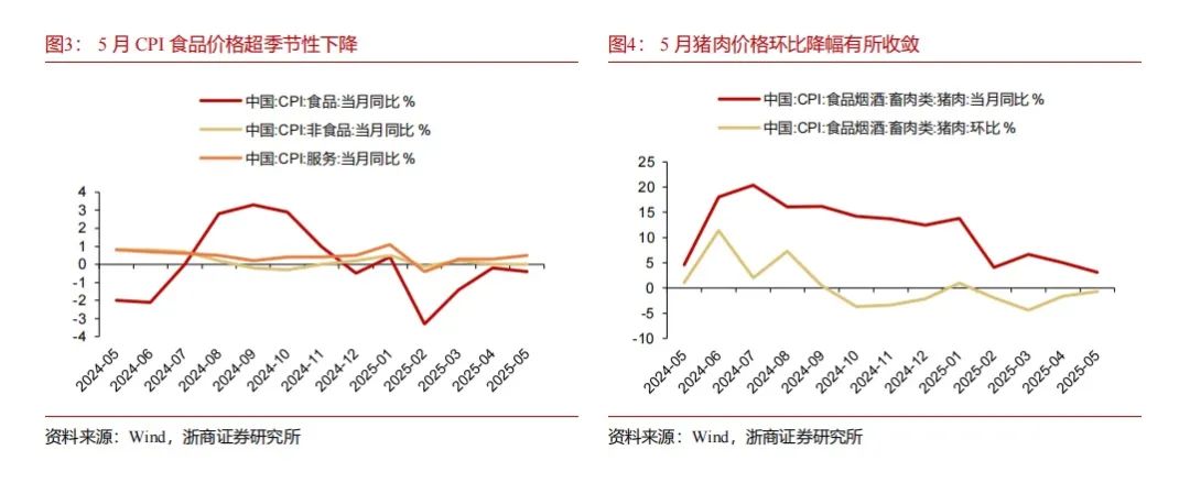 第三,服务价格上涨是核心CPI保持平稳的重要支撑。据国家统计局数据,5月扣除食品和能源价格的核心CPI同比上涨0.6%,涨幅比上月扩大0.1个百分点,核心CPI环比增速录得0(前值0.2%)。从环比变动看,5月可选消费需求持续回暖,叠加假日和各地开展文体娱乐活动等因素影响,宾馆住宿和旅游价格环比分别上涨4.6%和0.8%,均高于季节性水平,其中宾馆住宿价格涨幅创近十年同期新高;另一方面,随着夏装换季上新,服装价格上涨0.6%。